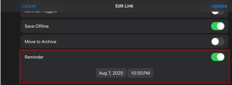 Speaking of reminders, this is a new feature that was added in Later, according to the Version History. When you save a new link, or edit an existing one, you can also create a reminder for it. You'll then receive the notification at the time you choose, and when you tap on the notification, it will launch the link. I love this!