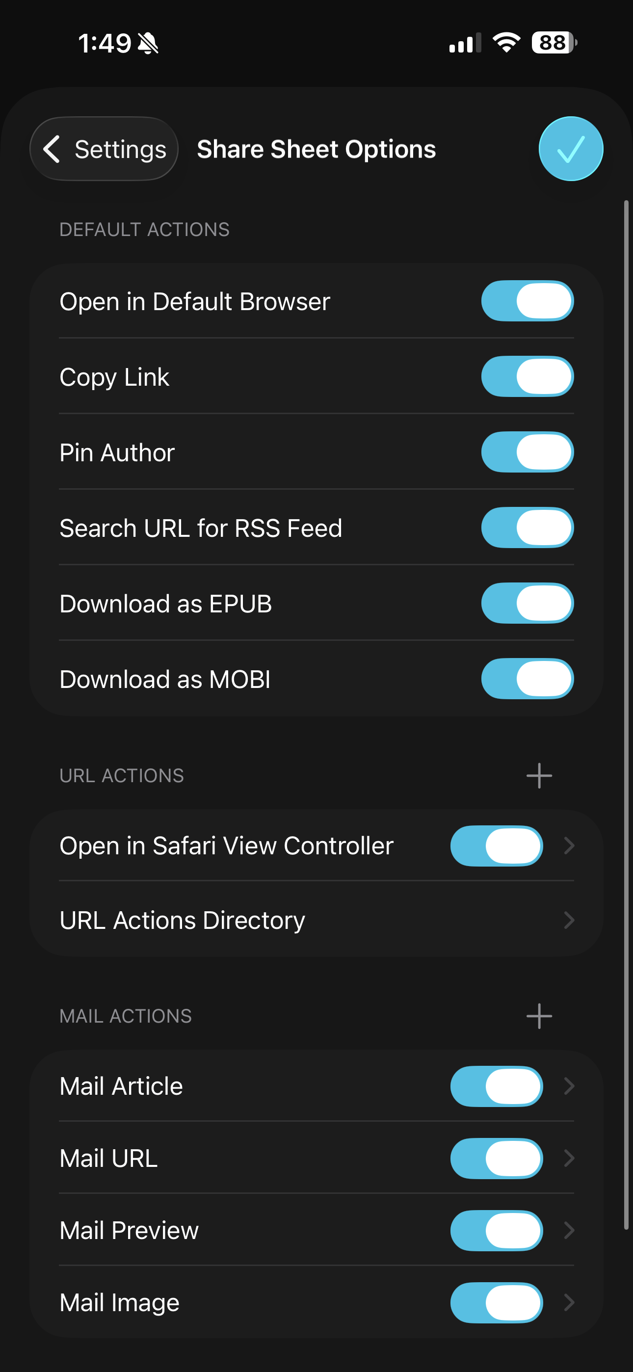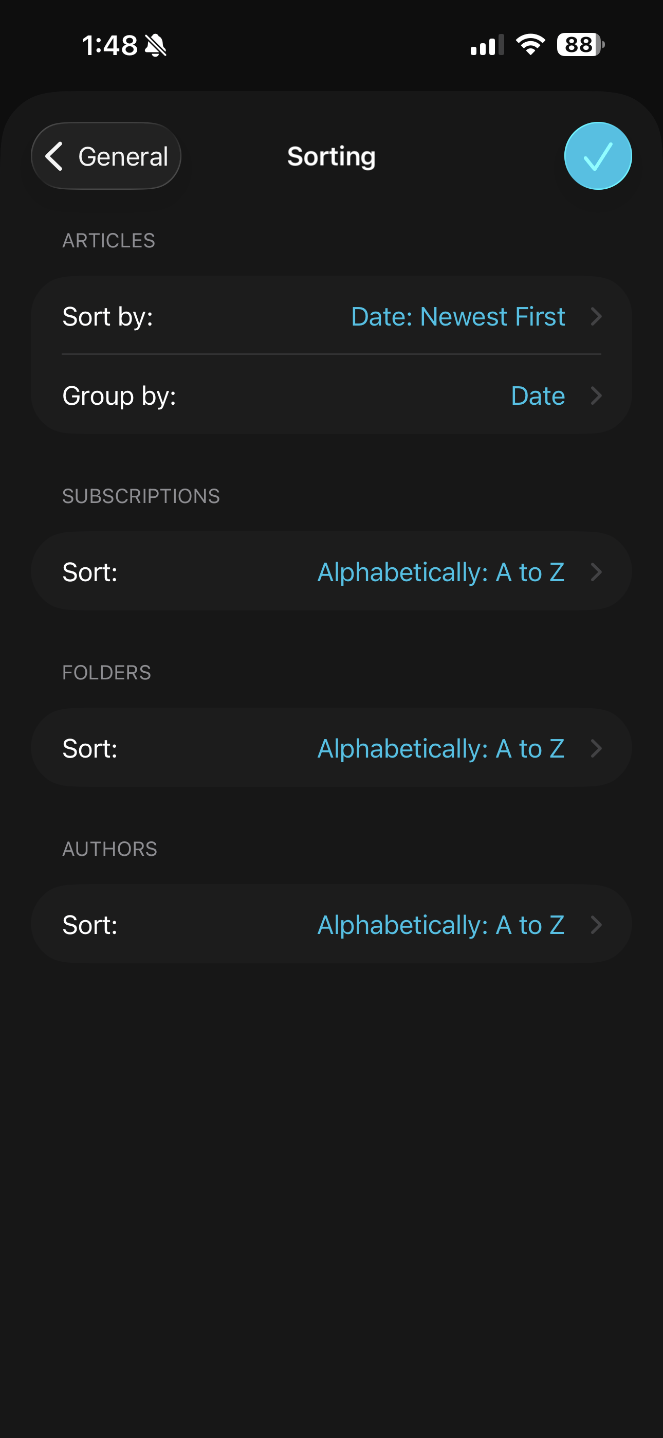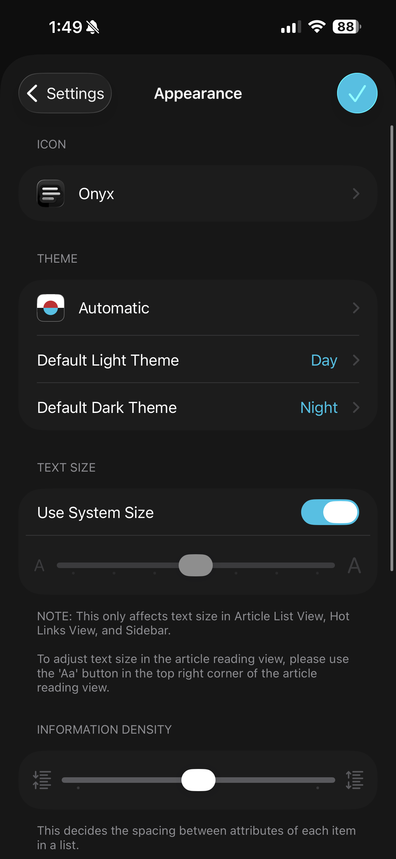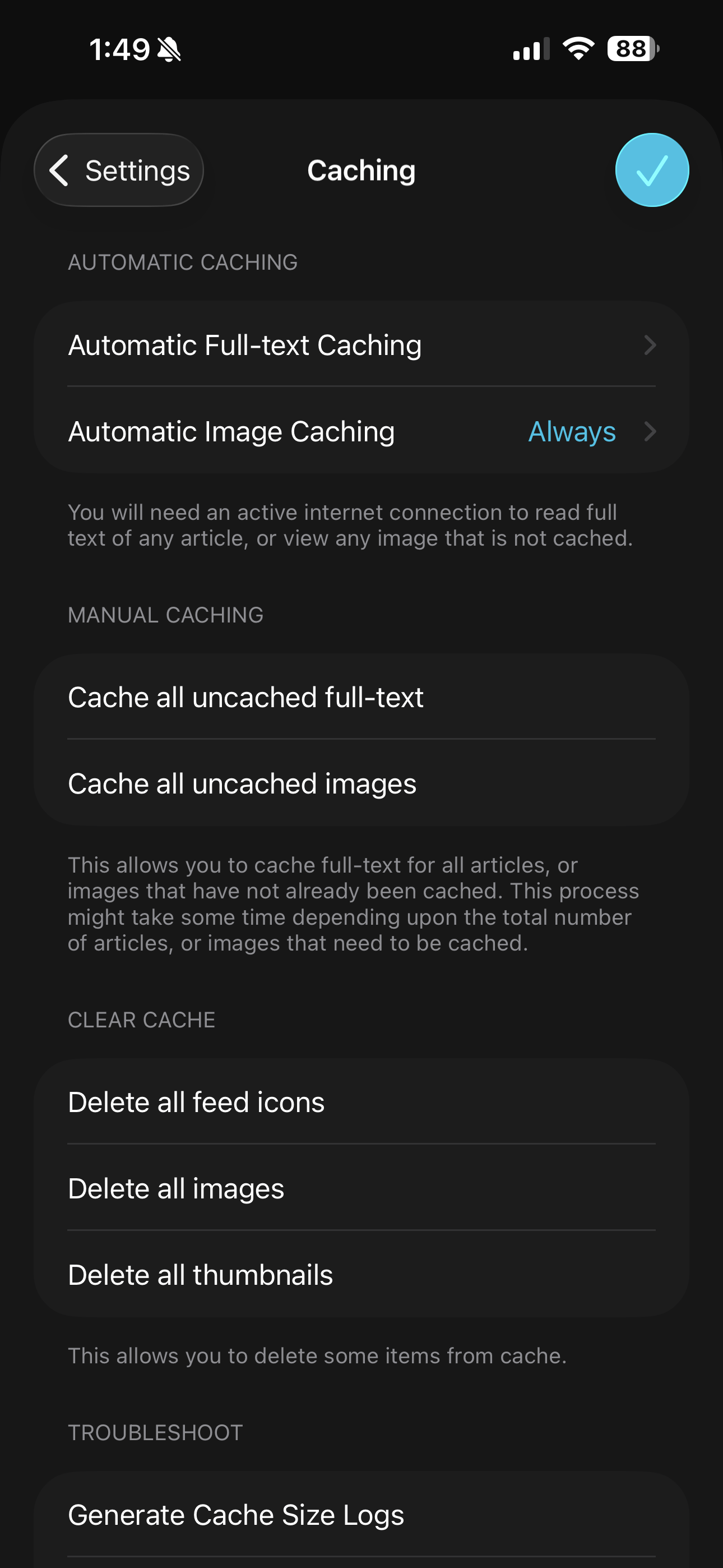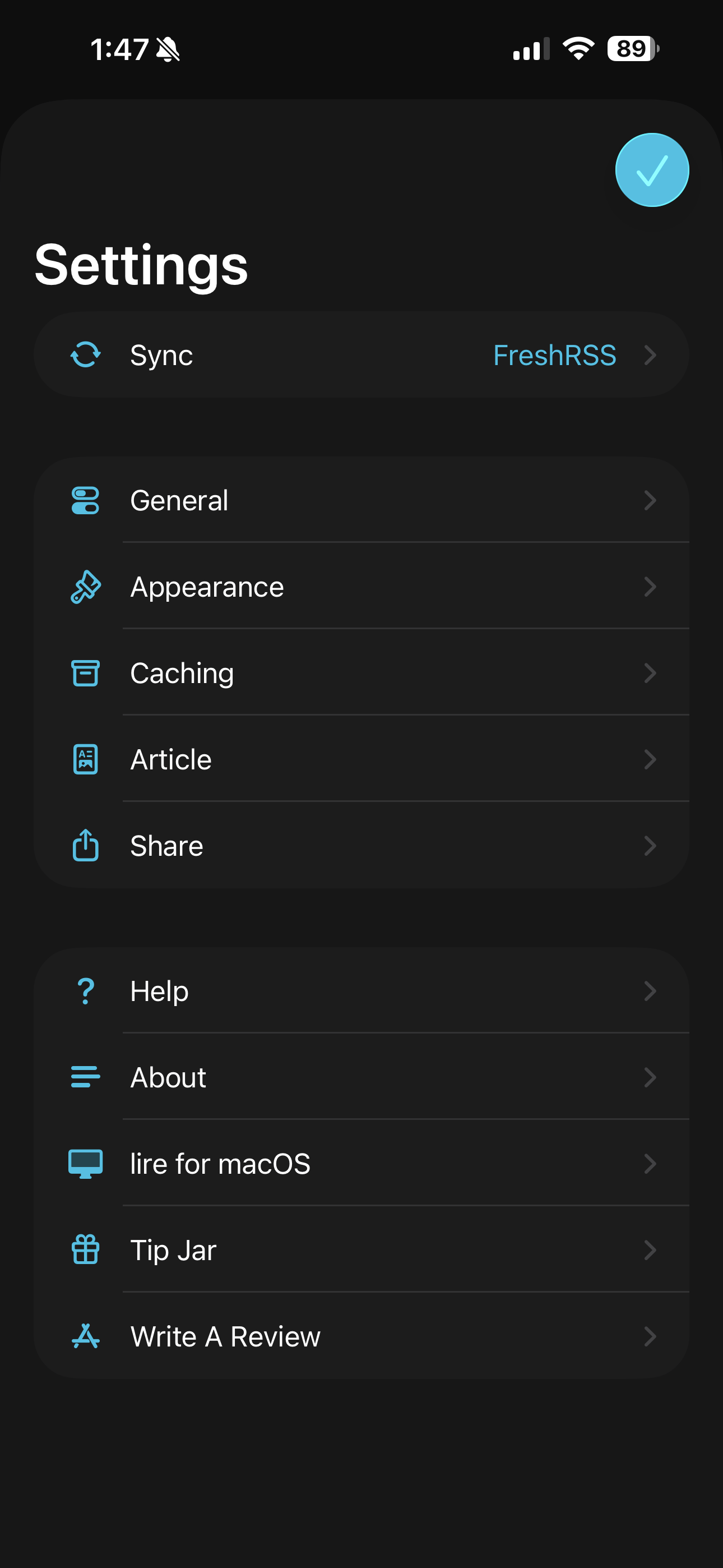 App settings are deep and finely tuned: you can tweak everything from appearance and sorting, to caching and share sheet actions. Want to change text size, adjust information density, or decide how and when things get marked as read? It’s all there. The amount of control lire gives you over your reading experience is on another level.