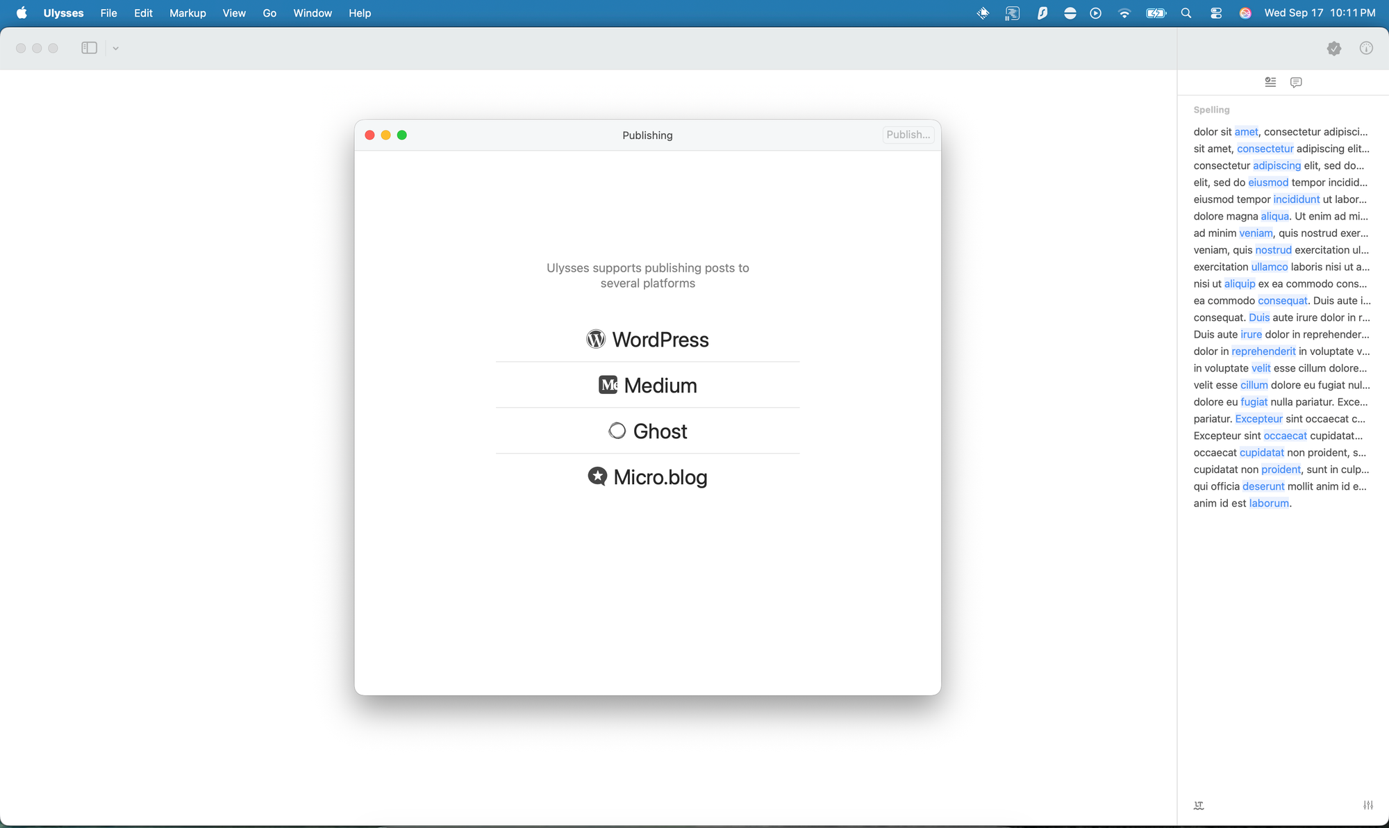 - Flexible Export \& Publishing: Export work in multiple formats, with the added bonus of direct Ghost Blog integration. You can publish drafts directly to your Ghost site, schedule posts, or update content without leaving Ulysses—making it incredibly useful for regular bloggers.