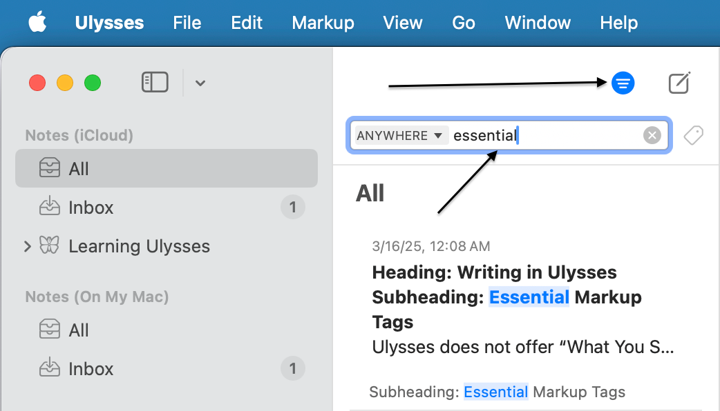 - Unified Library: Store all your writing—from blog posts to book chapters—in one easily searchable space. The search is so simple and tucked away until you need it. Clicking the icon shown in my screenshot, brings up the search box where you can choose the scope of the search.